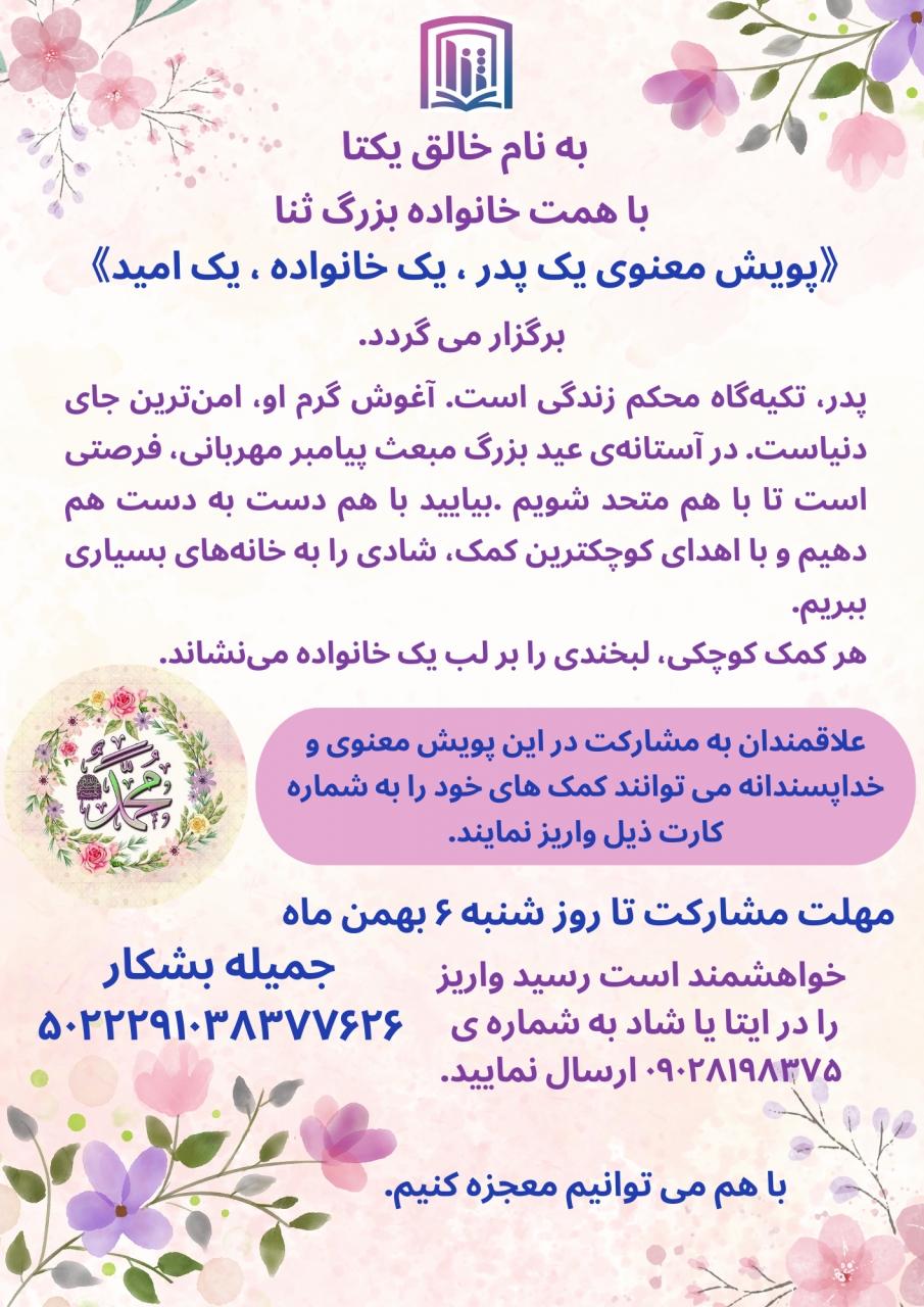 《پویش معنوی یک پدر ، یک خانواده ، یک امید》در آستانهی عید بزرگ مبعث پیامبر مهربانی، بیایید با هم متحد شویم و برای آزادی پدران زندانی تلاش کنیم. هر کدام از ما میتوانیم با اهدای کوچکترین کمک، سهمی در این کار خیر داشته باشیم.